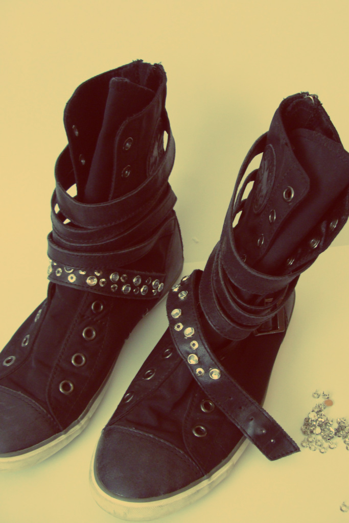 Escoge en tu armario que zapatos quieres intervenir para después decidir en que parte se vería bien algo de brillo. No puede ser una zona de material muy grueso para poder atravesar con las puntas de los taches o estoperoles. Si no tienes mucha paciencia para estos proyectos es mejor que escojas una zona no muy grande.