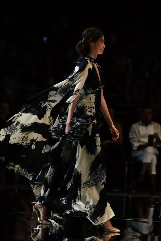 Silueta y movimiento: vestidos que flotan y envuelven (wraps), drapeados que generan asimetrías y volumen geométrico y orgánico. Es volumen blando, de caída y reflujo; el contrario complementario del volumen “tensado” de Mogollón. La prenda abraza y guía el paso; no lo encorseta.