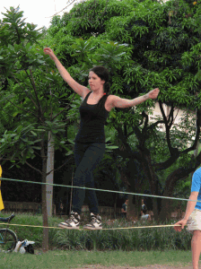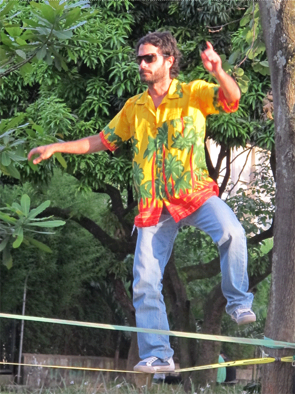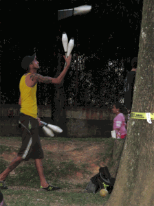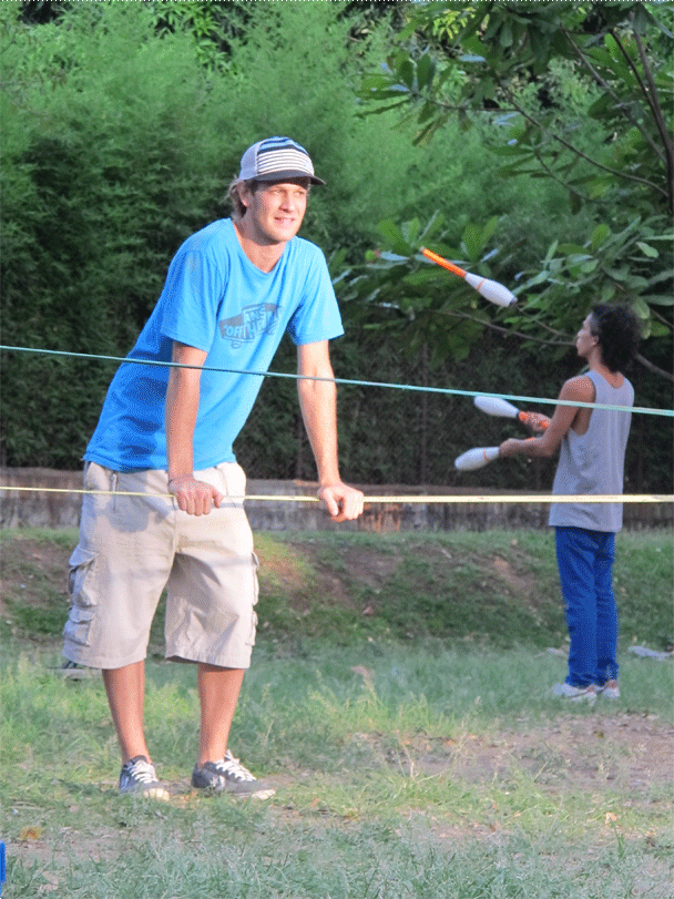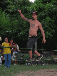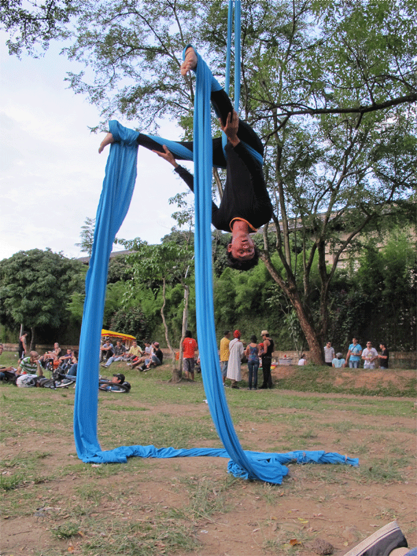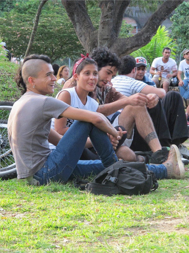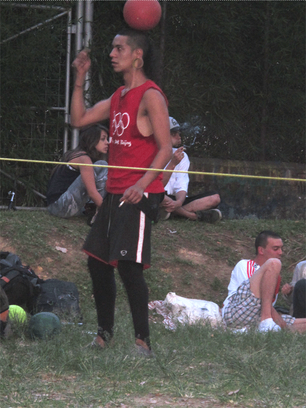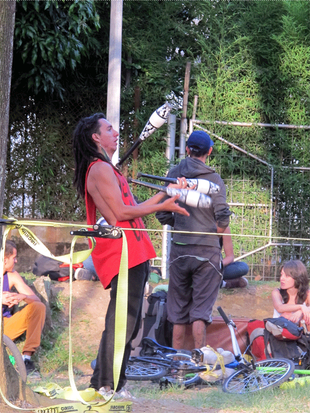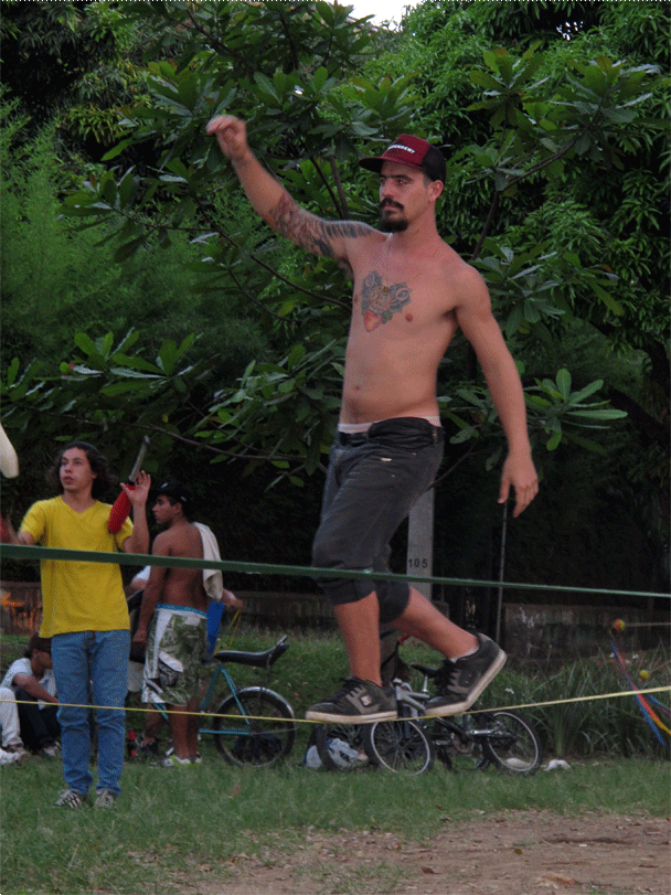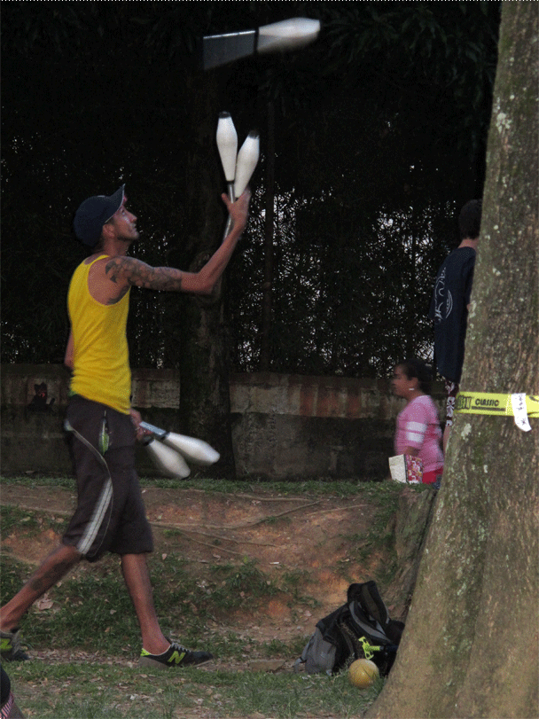 Una tela colgada de un árbol (Tela), una cinta tensada entre dos arboles (Slackline), un monociclo, un diábolo, varios conos y bolas, una bola de contact y una de fuchi, aunque pareciera estar describiendo un circo o una función de malabares no lo es, son las actividades que se llevan a cabo en el parque ciudad del rio un domingo en la tarde (solo se encuentran en una zona específica del parque). Actividades que no hacen parte de los deportes tradicionales a los que hemos estado acostumbrados, actividades que encierran una magia diferente, una actitud relajada, una relación con el cuerpo especial, actividades que cobijan un grupo de personas con un estilo de vida desenfadado, desestructurado y dinámico.